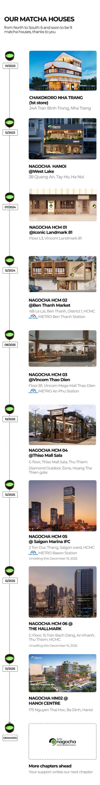 By July 2024, the journey reached new heights with Nagocha HCM 01 @Vincom Landmark 81, inside Vietnam’s most iconic skyscraper. The presence in Ho Chi Minh City grew stronger with Nagocha HCM 02 @Ben Thanh Market (Metro BEN THANH Station), opened in December 2024, and Nagocha HCM 03 @Vincom Thao Dien (Metro AN PHU Station), opened in August 2025.