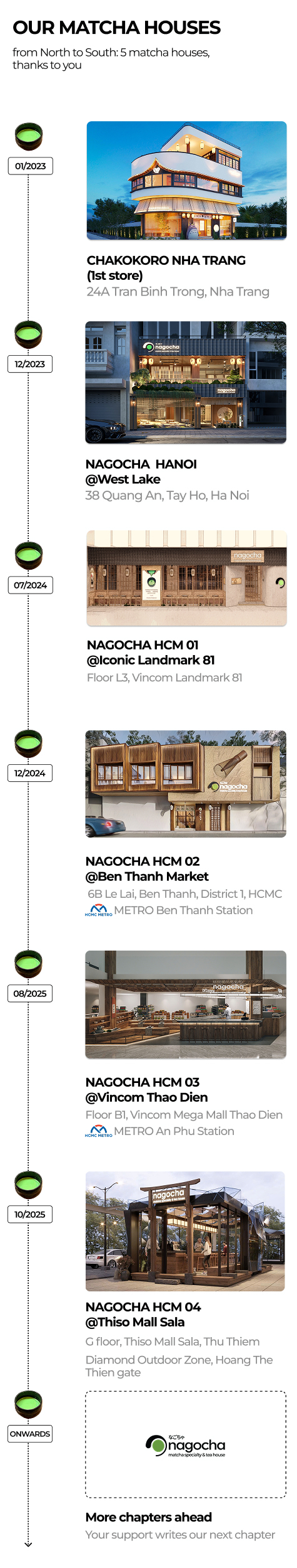 The story began in January 2023 with the very first store, Chakokoro Nha Trang, marking the arrival of Vietnam’s first dedicated matcha specialty & tea house. This milestone quickly positioned Nagocha as a trusted destination for matcha enthusiasts, drawing both local communities and international visitors.