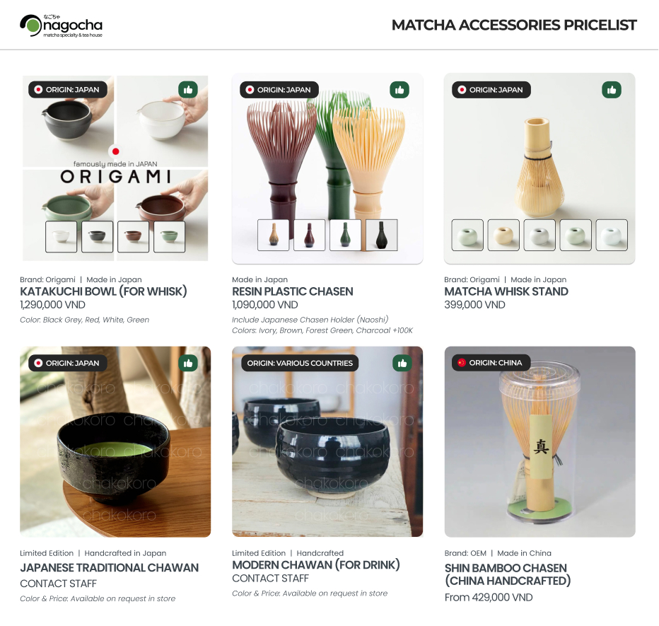 Nagocha chuyên các loại matcha dòng ceremonial-grade nhập khẩu từ nhiều vùng của Nhật Bản.